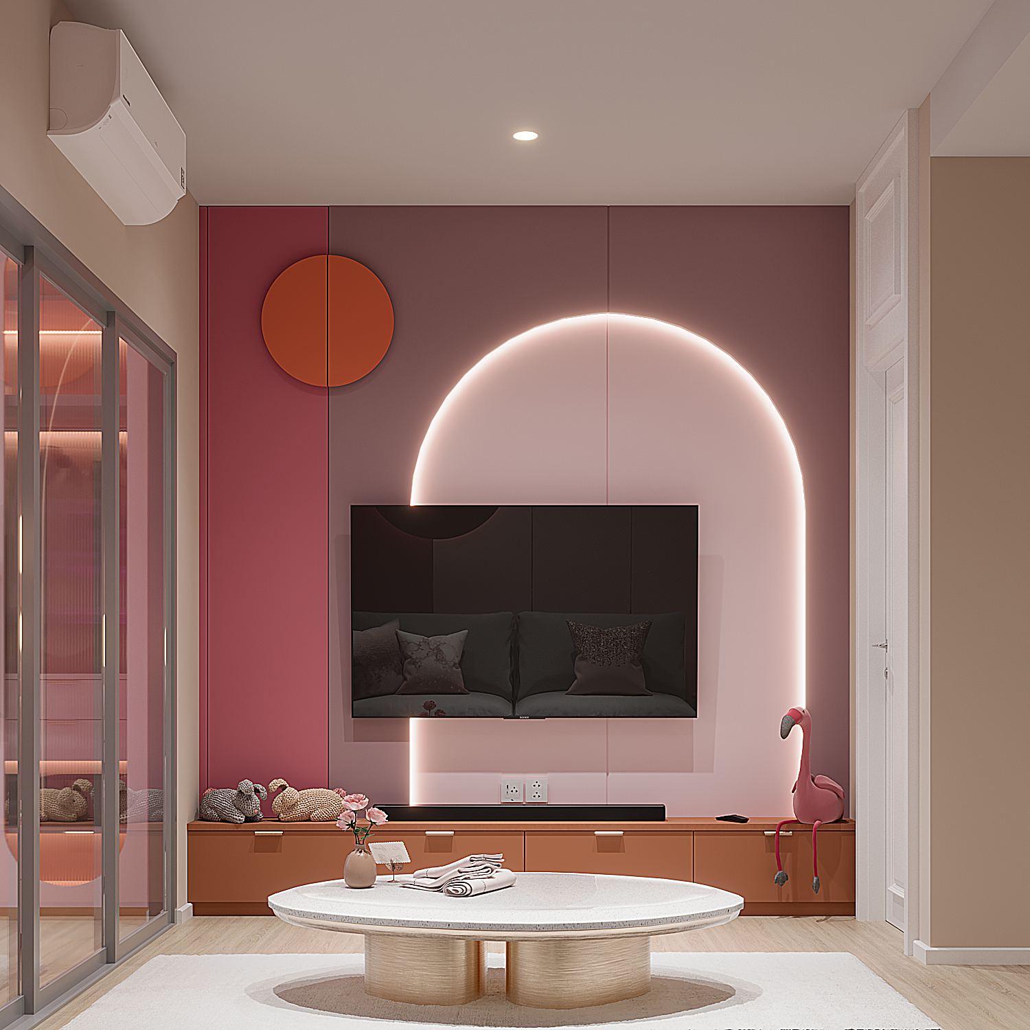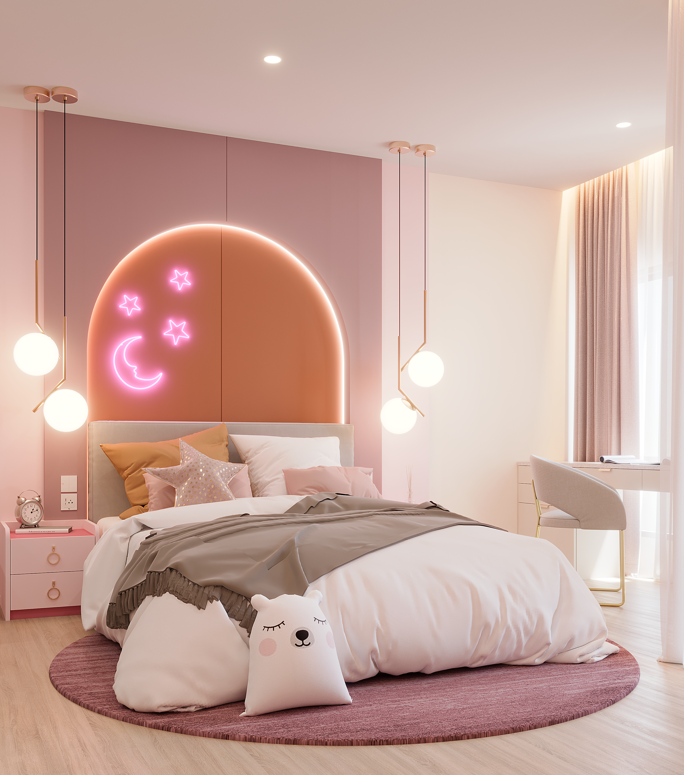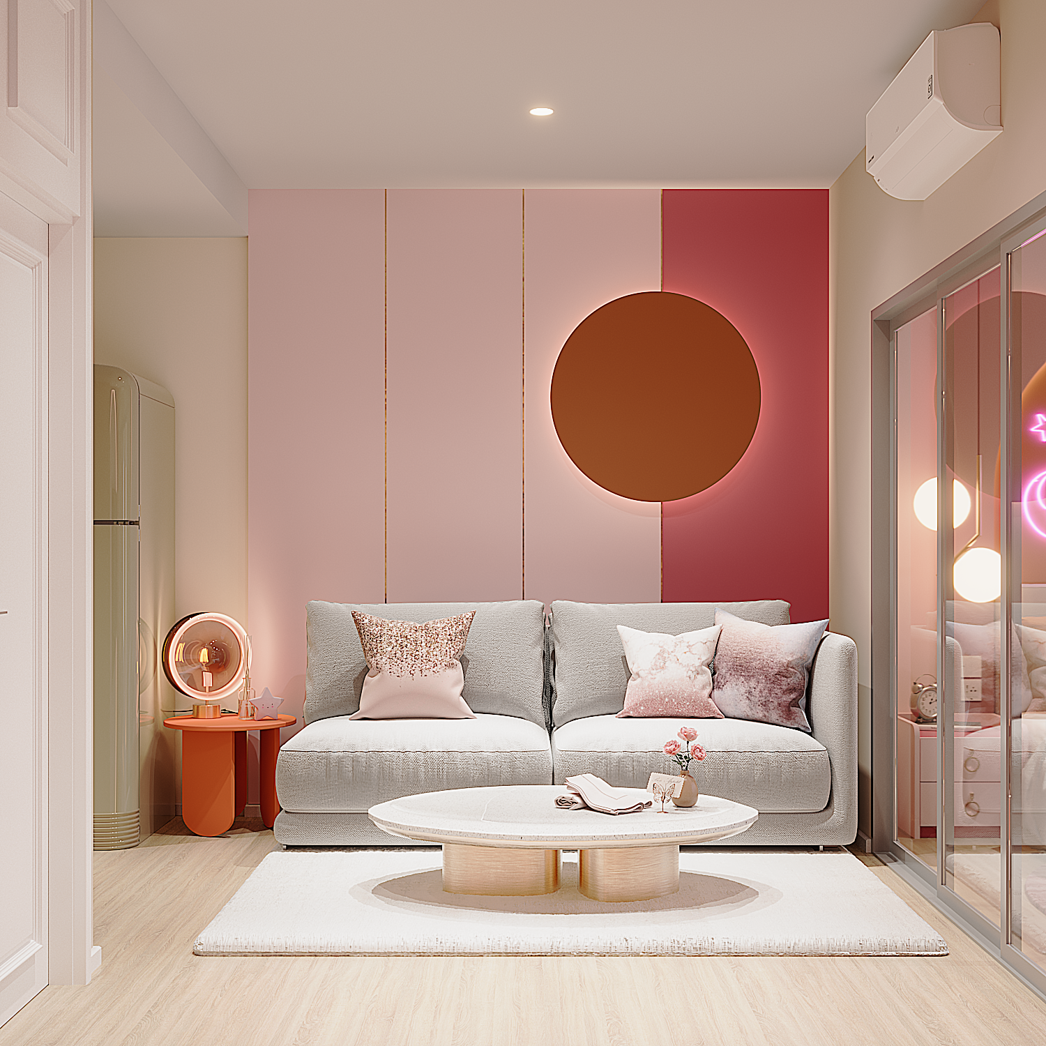 โทน “Blush Pink × Terracotta” นุ่มละมุน สว่างอบอุ่น ด้วยซุ้มโค้งและไฟเส้นซ่อน