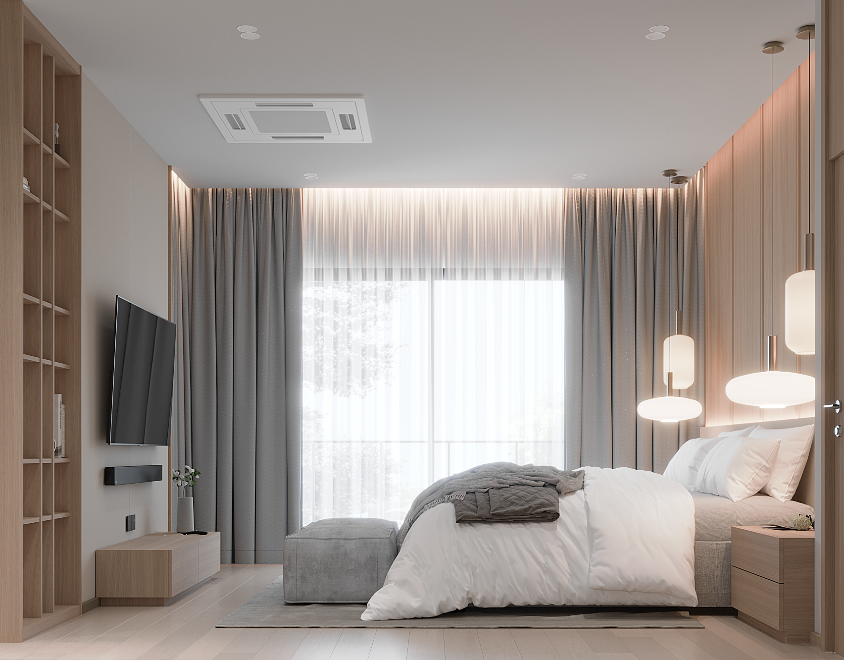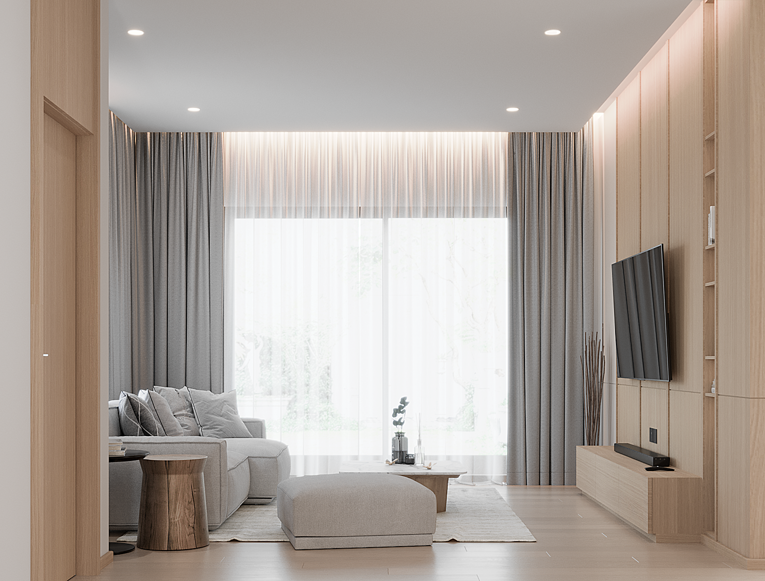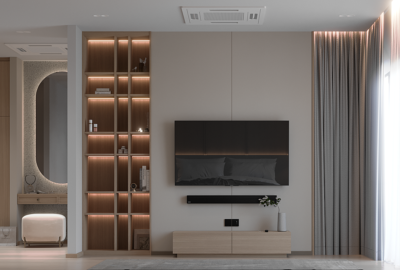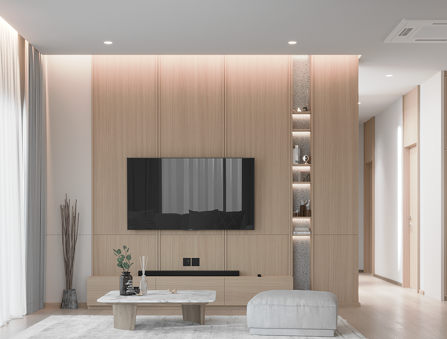- โทนไม้สว่าง + ไฟ LED 3000K ซ่อนในร่อง/ชั้น